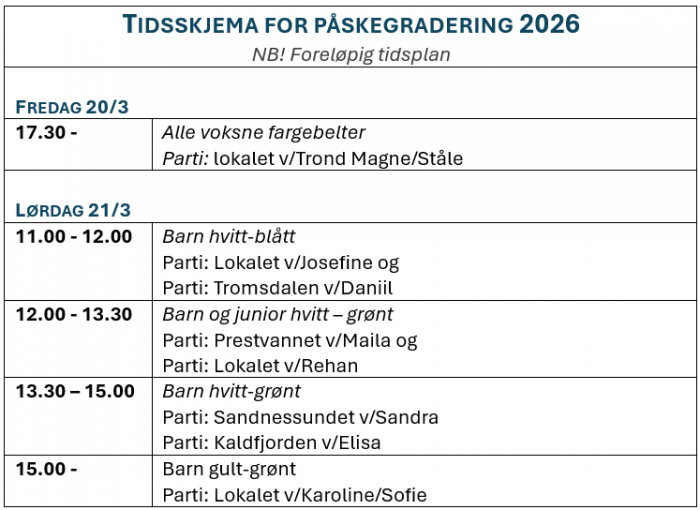 Kontakt din instruktør dersom du har spørsmål vedrørende graderingen: https://tromso.ntkd.no/instruktorer