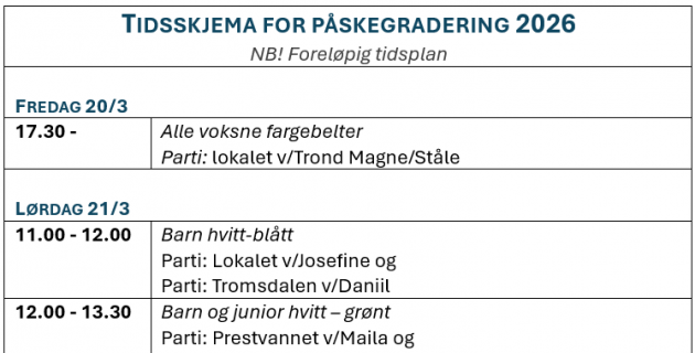 Fredag 06.12.2024 kl 18.00 er det regional sort belte gradering i vårt lokale. Elever med 1.gup og…